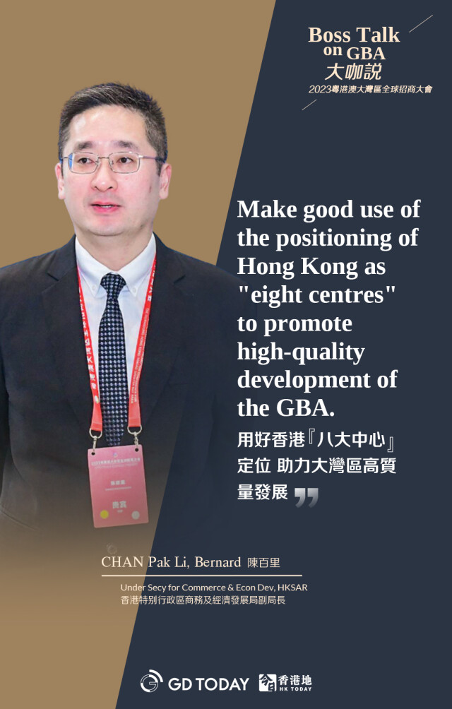 陳百里說:“我們會用好香港‘八大中心’定位和基建項目,例如北部都會區(qū)、深港河套科技園,推動創(chuàng)科發(fā)展;我們會用好香港人流、物流、資金流、信息流自由流通的優(yōu)勢,做好‘引進來 走出去’的工作。”他強調(diào),香港將不斷加強自身的發(fā)展動能,助力大灣區(qū)高質(zhì)量發(fā)展。