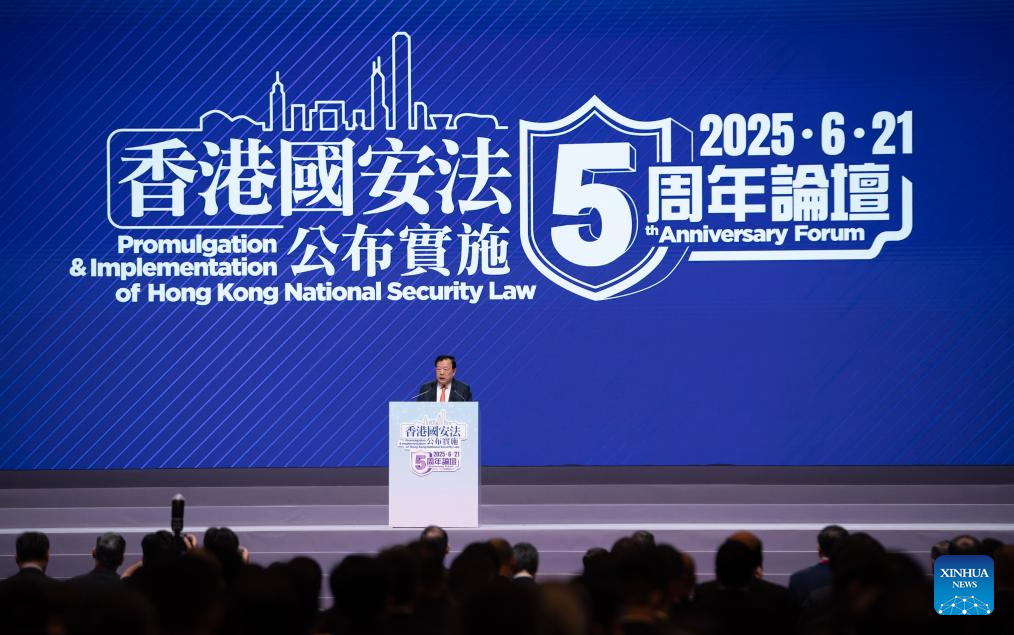Xia Baolong, head of the Hong Kong and Macao Work Office of the Communist Party of China Central Committee and the Hong Kong and Macao Affairs Office of the State Council, speaks at a forum to mark the 5th anniversary of the promulgation and implementation of the national security law in Hong Kong, south China, June 21, 2025. (Xinhua/Lui Siu Wai)