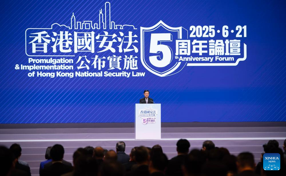 John Lee, chief executive of the Hong Kong Special Administrative Region, speaks at a forum to mark the 5th anniversary of the promulgation and implementation of the national security law in Hong Kong, south China, June 21, 2025. (Xinhua/Lui Siu Wai)