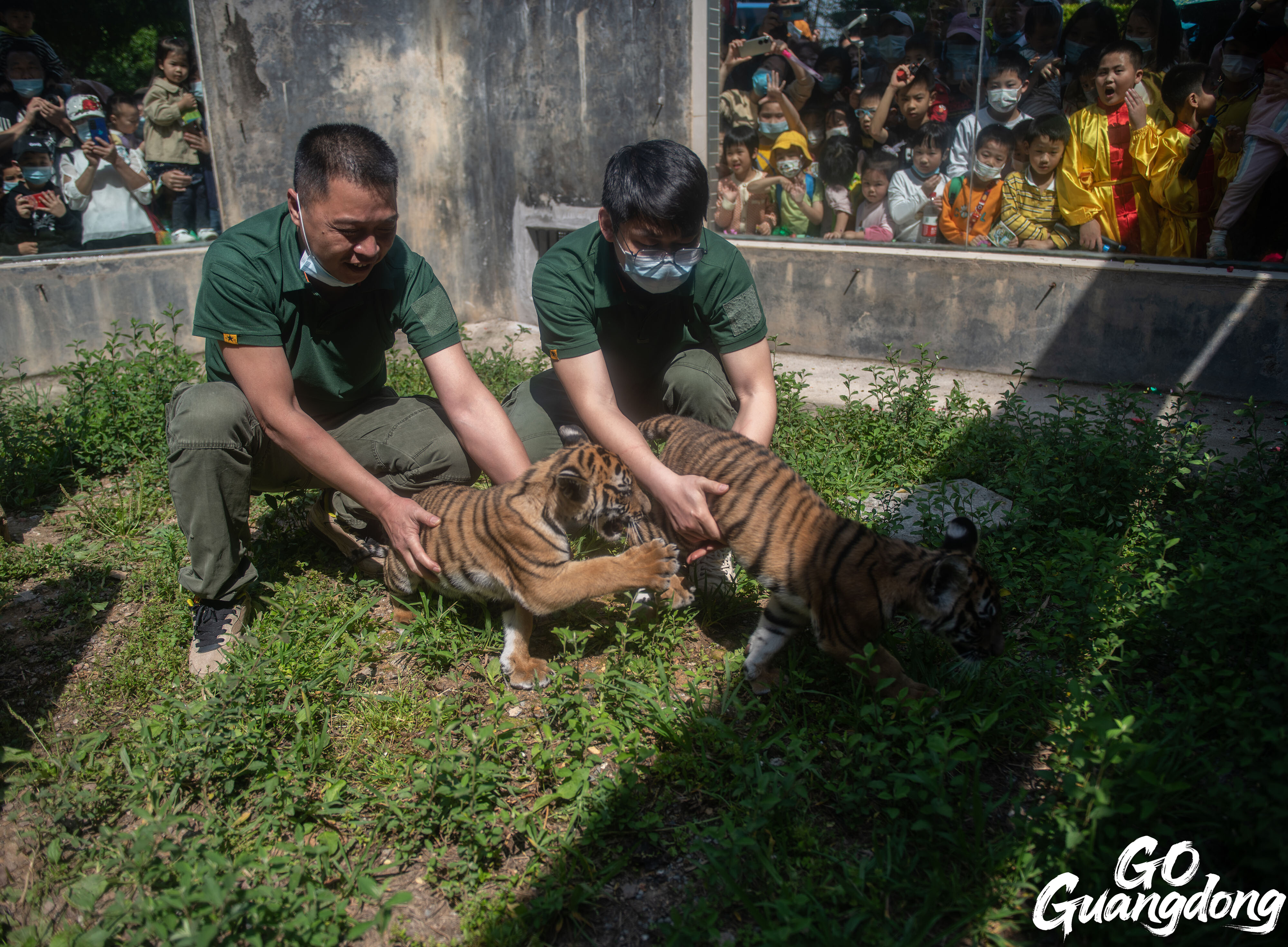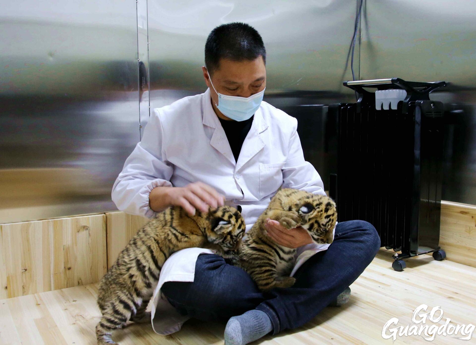 Tiger keeper Lei Shengqiao (L) with tiger cubs (Photo by 韶關發布)