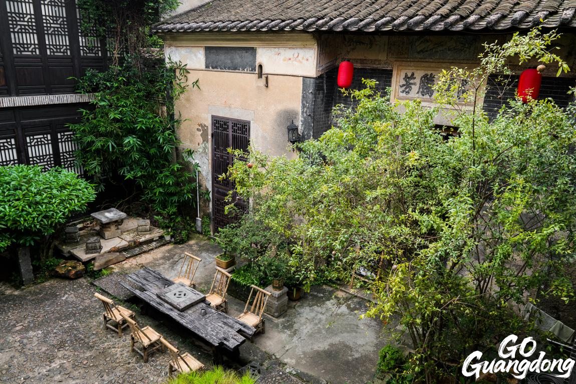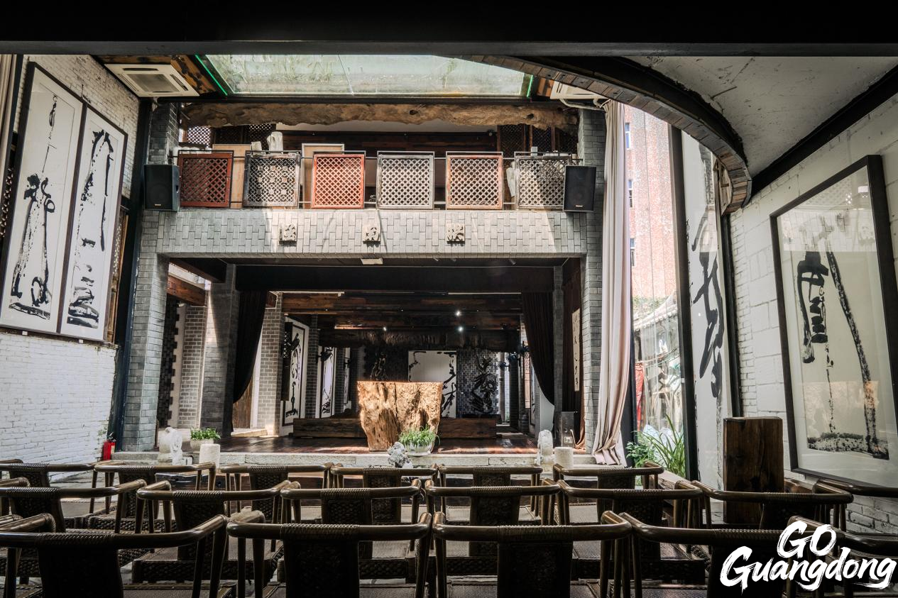 Sunrise Art Center, the three-storey courtyard, with blue bricks and black tiles, is naturally embellished with ancient wood furniture.