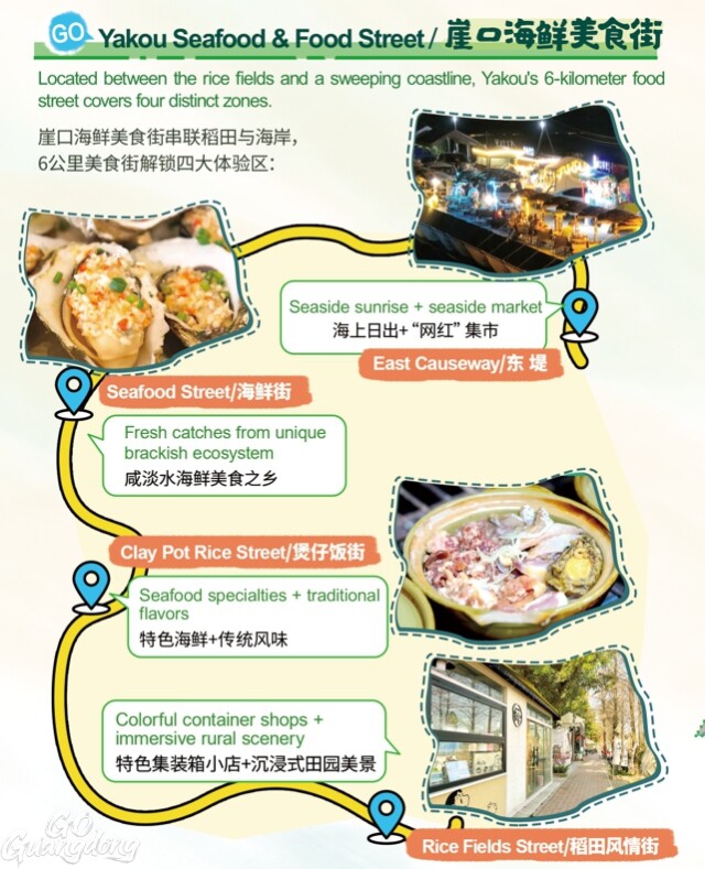 Yakou has transformed its scenic coastline along the Lingdingyang estuary into a 6-kilometer-long gourmet streets, featuring the container-themed street, seafood street, clay pot rice street, and the Dongdi seaside market. Strolling through these food streets, visitors can enjoy classic Cantonese claypot rice and freshly caught seafood.