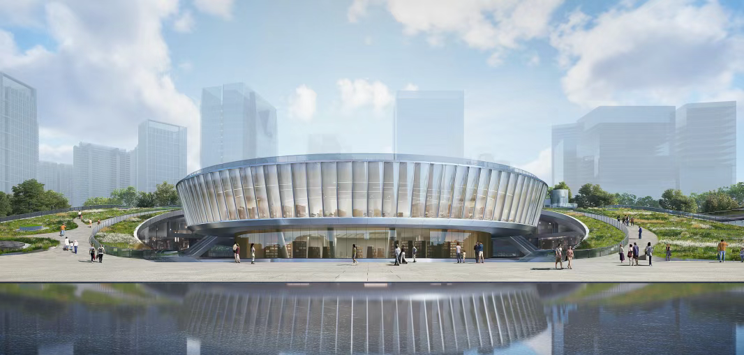 From an aerial view, the bookstore and an adjacent folk customs museum form two cylindrical structures that resemble jade dishes. They face two square buildings on the opposite end of a coastal green axis: the Bao'an Library and the Bao'an Children's Palace.