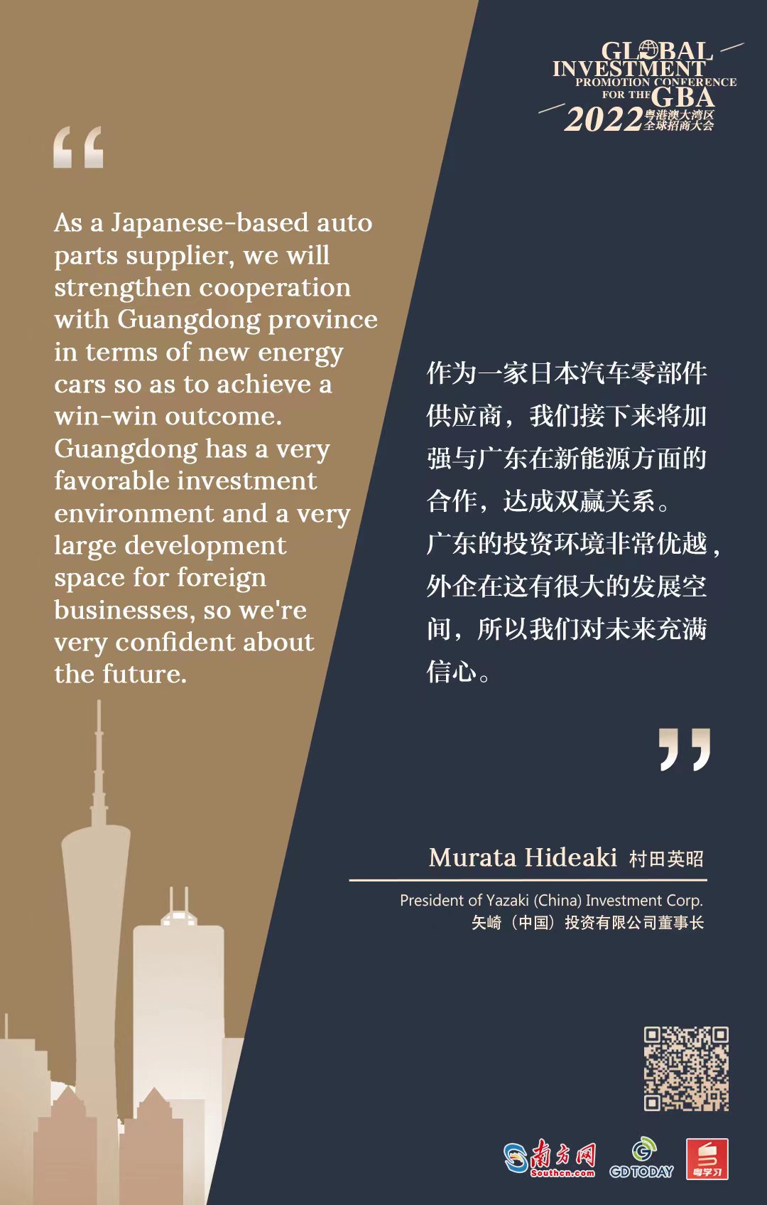 “As a Japanese-based auto parts supplier, we will strengthen cooperation with Guangdong province in terms of new energy vehicles so as to achieve a win-win outcome,” said Murata Hideaki, President of Yazaki (China) Investment Corporation, when sharing with GDToday at the 2022 Global Investment Promotion Conference for the Guangdong-Hong Kong-Macao Greater Bay Area (GBA) on December 21.