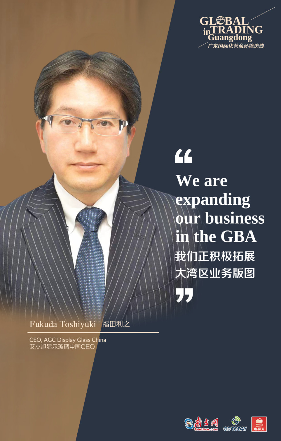 Fukuda Toshiyuki, CEO of AGC Display Glass China, is looking forward to expanding the company’s business in the Guangdong-Hong Kong-Macao Greater Bay Area (GBA), after AGC founded a company producing TFT-LCD glass in Guangdong’s Shenzhen city 12 years ago.