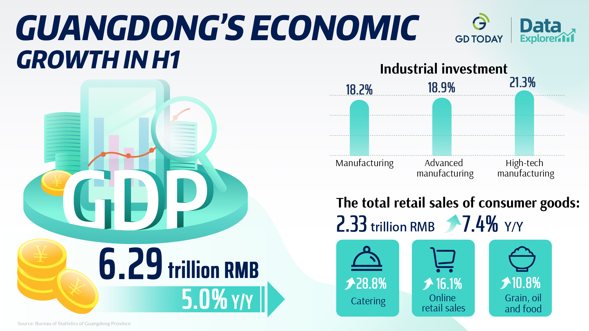 The gross domestic product (GDP) reached 6.29 trillion RMB, up 5 percent year-on-year in H1, data from the Bureau of Statistics of Guangdong Province showed on July 18.