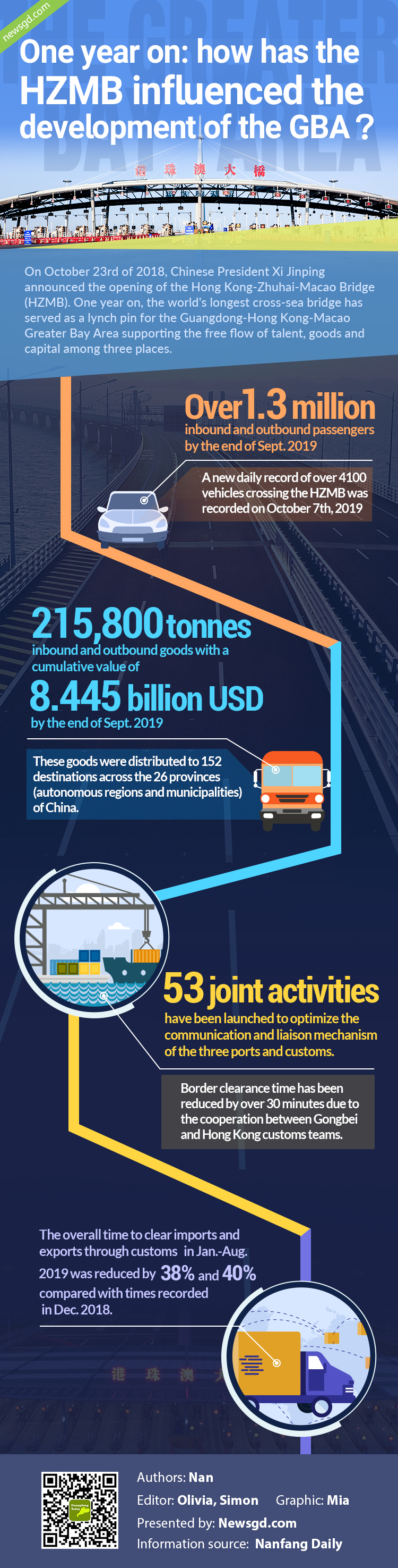 On October 23rd of 2018, Chinese President Xi Jinping announced the opening of the Hong Kong-Zhuhai-Macao Bridge (HZMB). One year on, the world's longest cross-sea bridge has served as a lynch pin for the Guangdong-Hong Kong-Macao Greater Bay Area supporting the free flow of talent, goods and capital among three places.