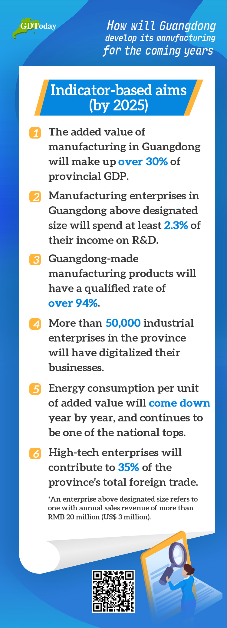 Guangdong has issued the 14th Five-year Plan on high-quality manufacturing development (hereinafter referred to as "the plan"), proposing by 2025 the added value of manufacturing in Guangdong will make up over 30% of provincial GDP, in which high-tech part account for up to 33%.