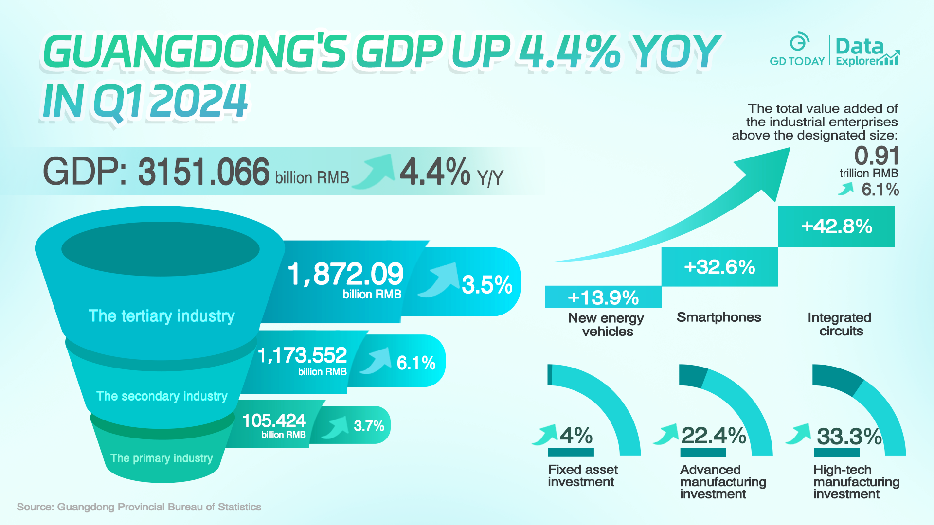In the first quarter of 2024, the overall economy of Guangdong Province maintained stable growth, showing a good start, according to data released by the Guangdong Provincial Bureau of Statistics on April 24. During this period, Guangdong's GDP reached 3.151066 trillion RMB, an increase of 4.4 percent year-on-year. Specifically, the added value of the primary industry was 105.424 billion RMB, up by 3.7 percent. The added value of the secondary industry was 1,173.552 billion RMB, up by 6.1 percent. And the added value of the tertiary industry was 1,872.09 billion RMB, up by 3.5 percent.