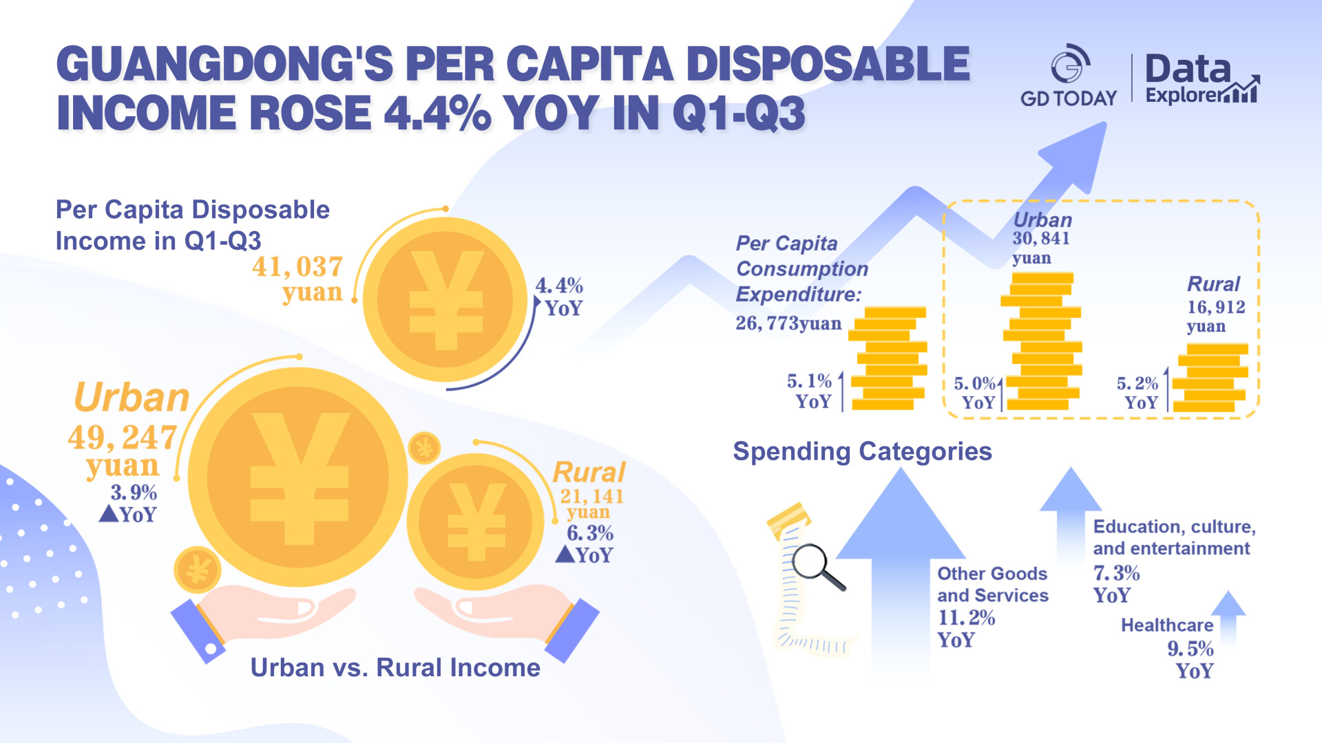 The average disposable income of residents in Guangdong for the first three quarters of 2024 reached 41,037 yuan, according to the data released by the Survey Office of the National Bureau of Statistics in Guangdong on October 19, reflecting a year-on-year growth of 4.4%. When adjusted for inflation, the real growth stood at 4.2%, indicating a positive economic trend despite slight rises in living costs.