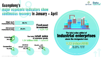 Guangdong’s economy has maintained its recovery momentum, as shown by the January-to-April major indicators released by the Bureau of Statistics of Guangdong Province on May 25.