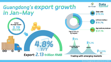 Guangdong's foreign trade development is still resilient and stable with small monthly fluctuations, as the first five months of 2023 have seen the province's exports increased by 4.8 percent to 2.13 trillion RMB, according to the latest data from Guangdong Sub-administration of GACC.