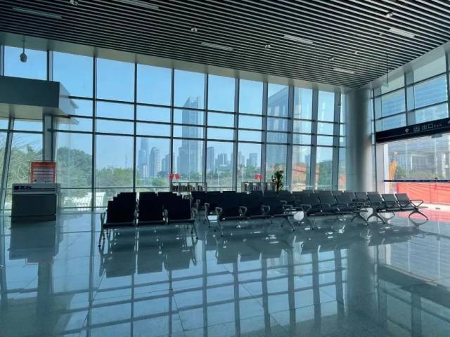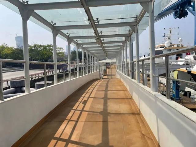 碼頭上停靠著兩艘客船,透過(guò)通關(guān)閘口的落地玻璃即可看到廣交會(huì)展館……
