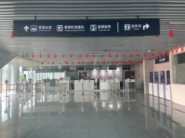 走進(jìn)聯(lián)檢樓大廳可以看到,通過(guò)首層安檢機(jī)器,即可搭乘電梯前往二層出境大廳前往港澳,在這一層,旅客可以在整潔寬敞的出發(fā)大廳窗口購(gòu)買船票,也可以辦理自助取票和香港機(jī)場(chǎng)值機(jī)業(yè)務(wù),辦理好值機(jī)業(yè)務(wù)后通過(guò)出境查驗(yàn)通道就可以到達(dá)登船口。