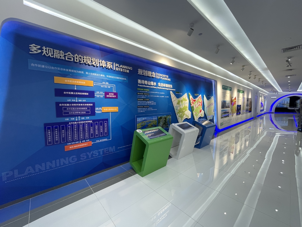 展廳運用國際化創新設計理念,結合現代化高科展示技術,突破傳統平面展示模式,多項互動展項體現了展廳的高智能度與展覽的強交互性。內設VR視覺技術區域、紅外體感互動區域和立體模型,直觀生動地展示了合作區的發展成果及未來規劃,讓采風團收獲了身臨其境的參觀體驗。