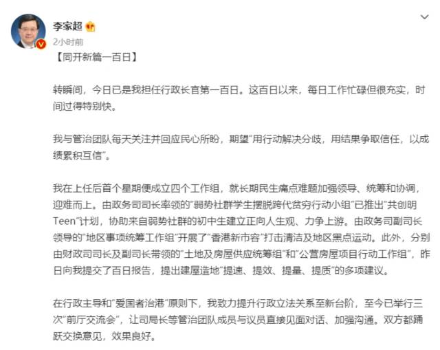 10月8日是香港特別行政區行政長官李家超上任第100天。他在社交平臺發文回顧這100天的工作,稱“每日工作忙碌但很充實”。他總結了在社會民生、粵港澳大灣區發展、防疫抗疫等多方面的工作,期望“用行動解決分歧,用結果爭取信任,以成績累積互信”。