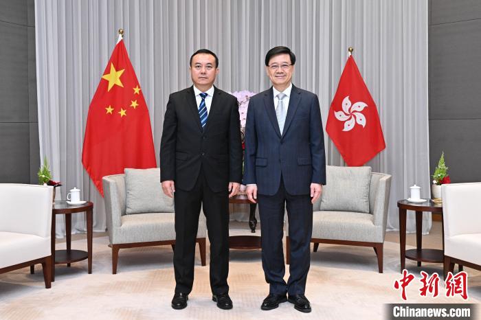 12日,李家超(右)與陳勇會面。 香港特區政府新聞處 供圖