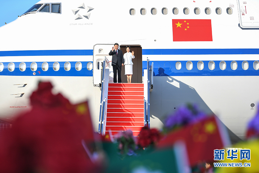 12月18日,中共中央總書記、國家主席、中央軍委主席習近平乘專機抵達澳門,出席將于20日舉行的慶祝澳門回歸祖國20周年大會暨澳門特別行政區第五屆政府就職典禮并視察澳門。這是習近平和夫人彭麗媛走出艙門,向歡迎人群揮手致意。 新華社記者 龐興雷 攝