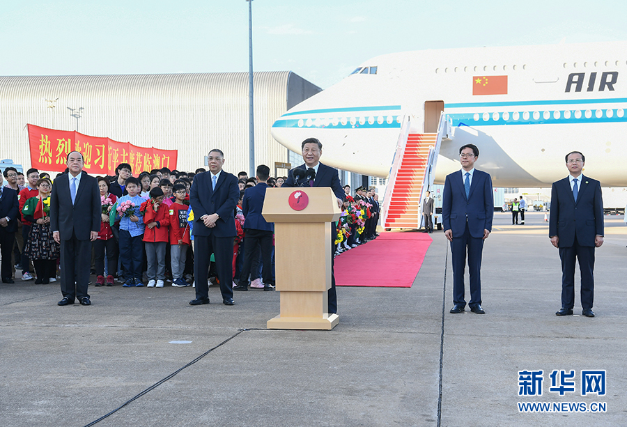 12月18日,中共中央總書記、國家主席、中央軍委主席習近平乘專機抵達澳門,出席將于20日舉行的慶祝澳門回歸祖國20周年大會暨澳門特別行政區第五屆政府就職典禮并視察澳門。這是習近平在機場發表重要講話。 新華社記者 謝環馳 攝