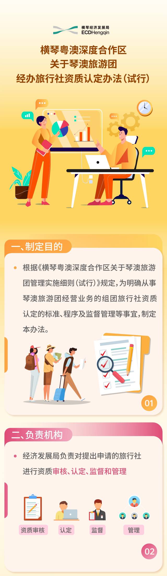 為保障合作區(qū)旅游市場規(guī)范經營,合作區(qū)經濟發(fā)展局配套制定《橫琴粵澳深度合作區(qū)關于琴澳旅游團經辦旅行社資質認定辦法(試行)》(下稱《認定辦法》),進一步明確從事琴澳旅游團經營業(yè)務的組團旅行社資質認定的標準、程序及監(jiān)督管理等事宜。