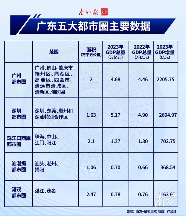 然而,放眼高速發展的粵港澳大灣區,慢進也是退。2023年,面積與珠西都市圈相近的廣州都市圈,GDP總量達到4.69萬億元。而東岸5萬億量的深圳都市圈,在總量和增量上更是遙遙領先,與珠西都市圈的差距還在擴大。