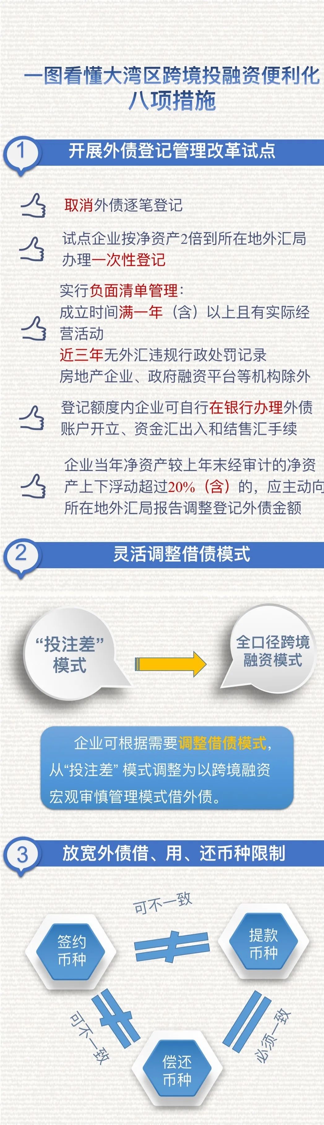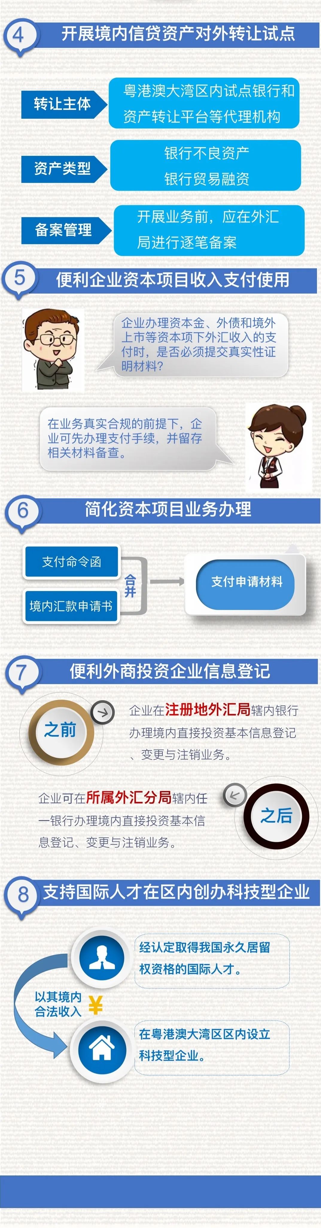 為落實(shí)《粵港澳大灣區(qū)發(fā)展規(guī)劃綱要》《關(guān)于支持深圳建設(shè)中國特色社會主義先行示范區(qū)的意見》,提升外匯管理服務(wù)實(shí)體經(jīng)濟(jì)發(fā)展水平,經(jīng)國家外匯管理局批準(zhǔn),外匯局廣東省分局與深圳市分局聯(lián)合發(fā)布了《關(guān)于外匯管理支持粵港澳大灣區(qū)和深圳先行示范區(qū)發(fā)展的通知》(粵匯發(fā)〔2020〕15號),明確在粵港澳大灣區(qū)開展外債登記管理改革、銀行信貸資產(chǎn)對外轉(zhuǎn)讓和資本項目收入支付便利化改革等八項試點(diǎn)業(yè)務(wù)。